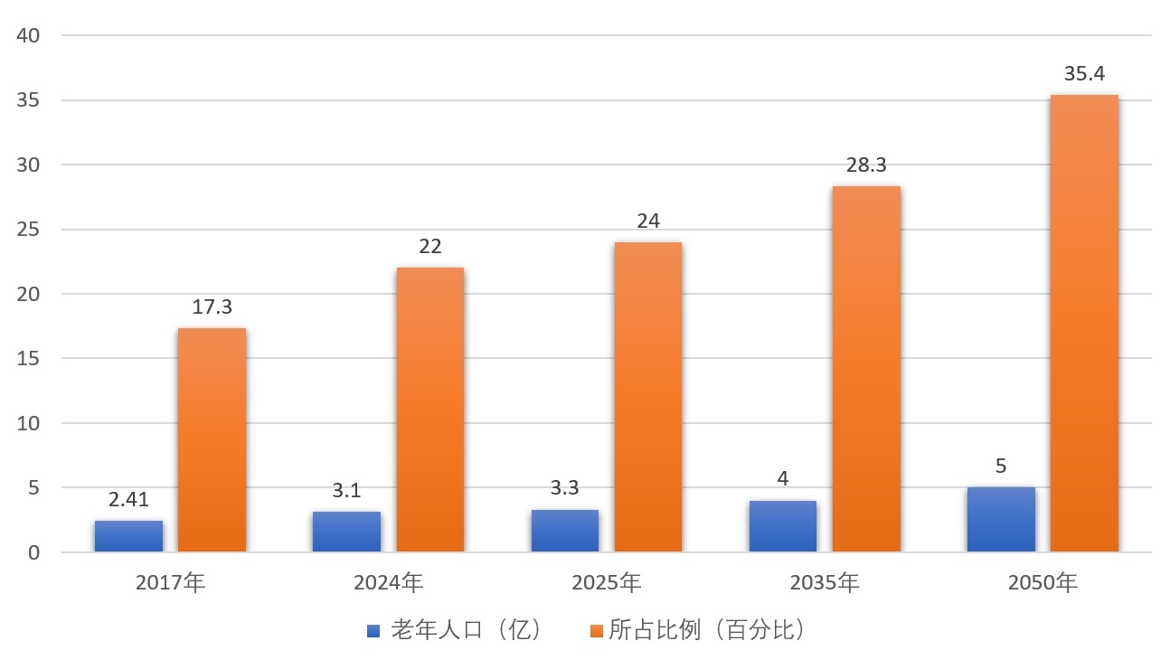 我國確立了“以居家為基礎、社區為依托、機構為支撐”的養老產業框架和9073養老格局,90%在家中養老(居家養老);2025年1月17日,國家統計局發布,截至2024年底,我國60歲及以上老年人口有3.1億人,占總人口22%,其中,65歲及以上人口超2.2億人,占15.6%。2035年左右我國60歲及以上老年人口將突破4億,在2050年前后達到頂峰,約占總人口的1/3。那時,中國將有4.8億、甚至接近5億老年人,是世界上老年人口最多的國家。養老服務業目前已達10萬億市場規模。